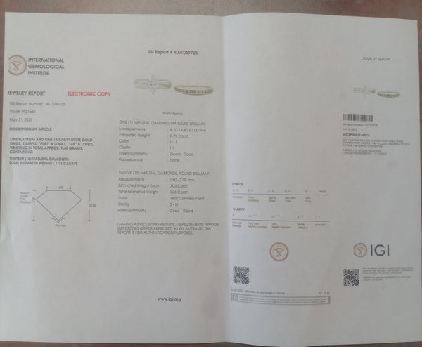 EST 0.75 CT Center Natural Marquise Diamond Ring HI I1 & Band